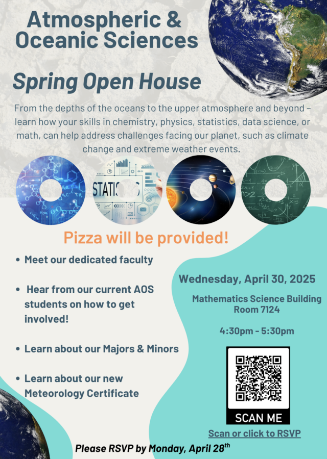 Come learn more about the AOS department and how you can get involved in the important work of climate science. This event is for undeclared majors, transfer students, and students majoring fields in the physical. Regardless of your scientific background, there is a place for you at AOS as a major, minor, or more.